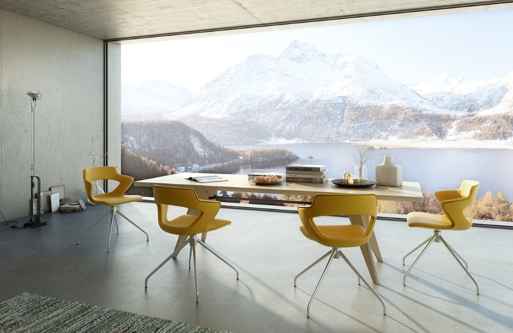 The stool is part of a larger product family which includes a four-legged chrome and wood frame, a sled and style frame and an office chair version. Each of these pieces are designed to be functional and stylish, providing the perfect addition to any space.