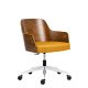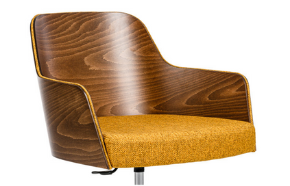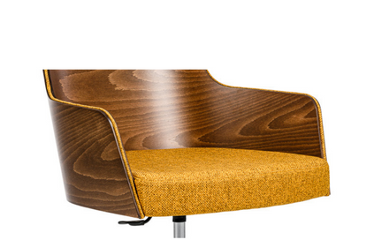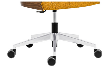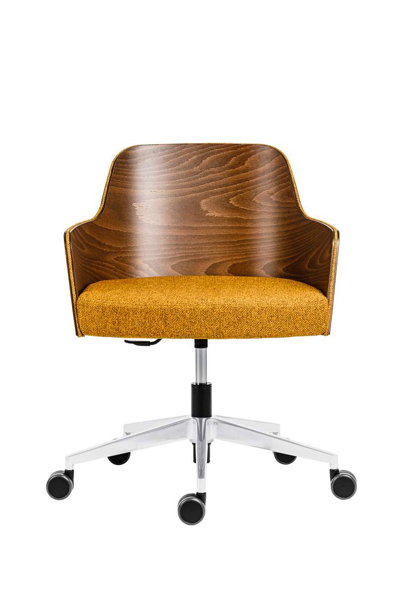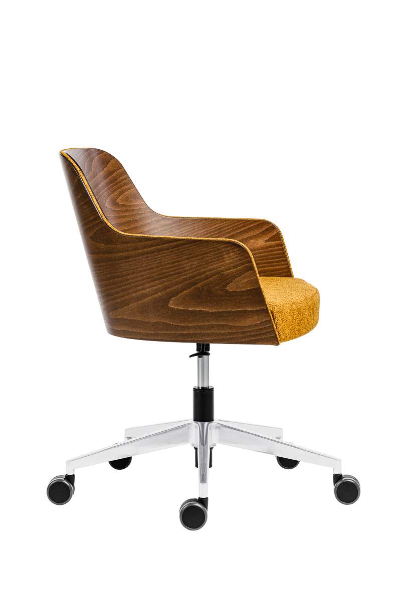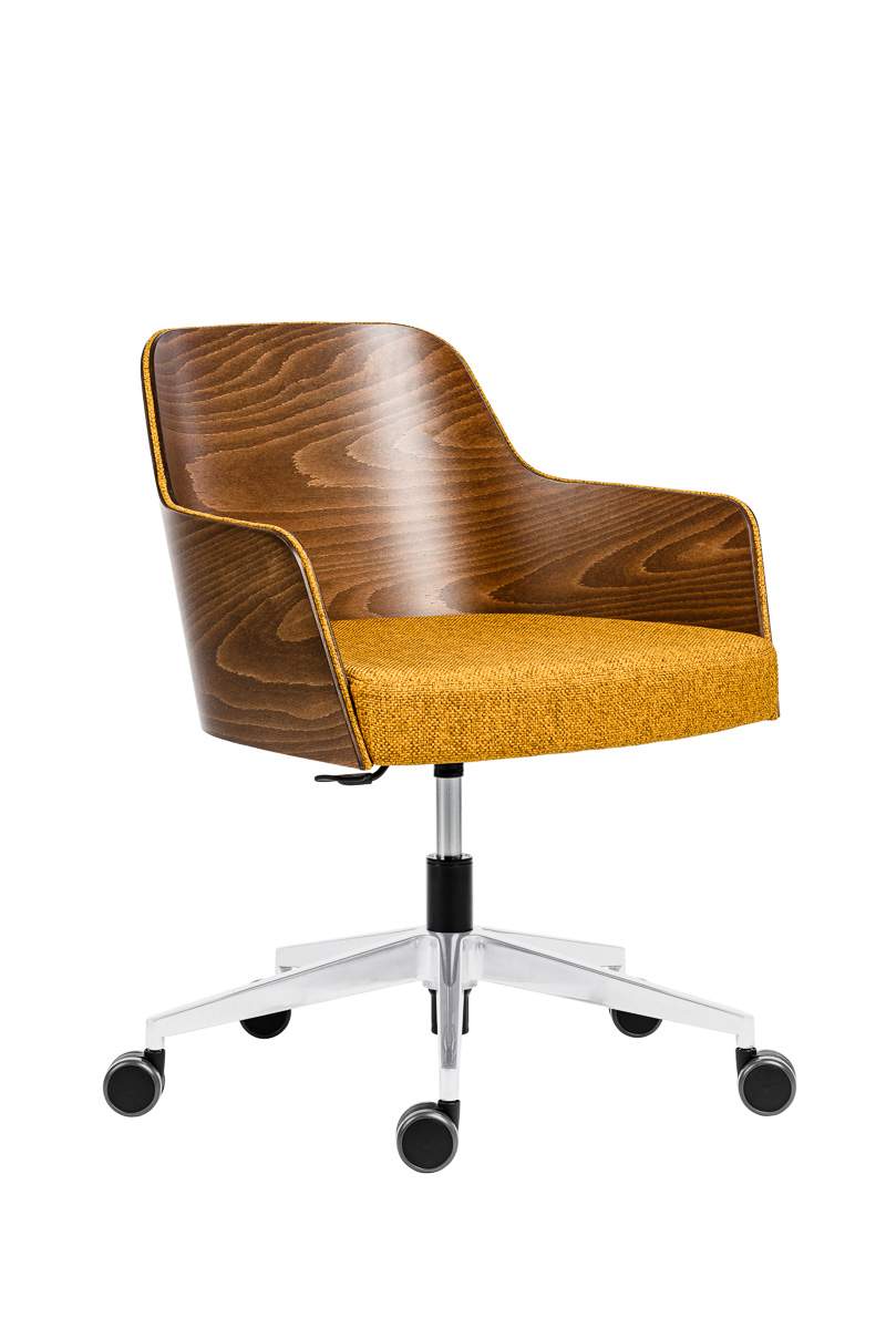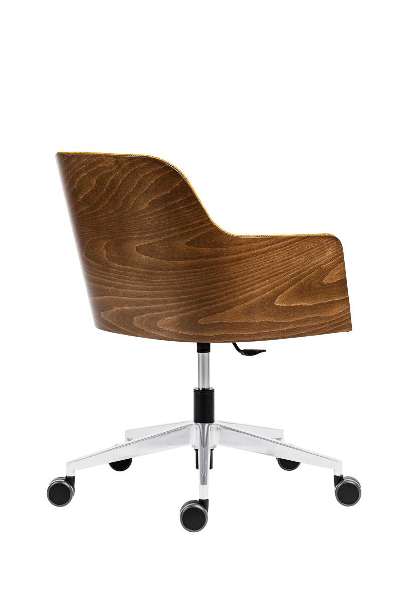 The Rud conference chair has a varnished, wooden shell that is both stylish and durable. It also has integrated armrests for added comfort and support. The seat is upholstered, providing a soft and comfortable place to sit. The chair is equipped with a height adjustable mechanism, which allows you to find the perfect position for your needs. It sits on a chromed five-spoke base, which provides a stable foundation and a modern look. Its combination of functionality, comfort, and style makes it an excellent choice for any setting, be it a professional office space or home use.